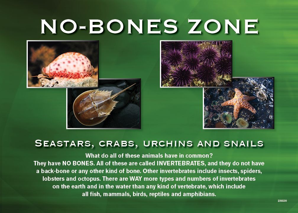 ¿Qué tienen en común todos estos animales? No tienen HUESOS. Todos estos se llaman INVERTEBRADOS, y no tienen columna vertebral ni ningún otro tipo de hueso. Otros invertebrados incluyen insectos, arañas, langostas y pulpos. Hay MUCHOS más tipos y cantidades de invertebrados en la tierra y en el agua que cualquier tipo de vertebrado (los cuales incluyen a todos los peces, mamíferos, aves, reptiles y anfibios).